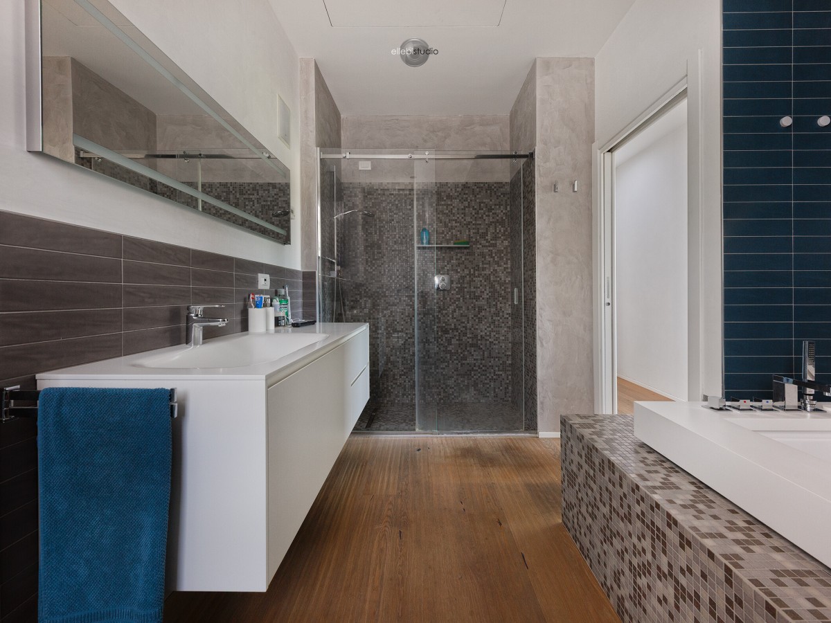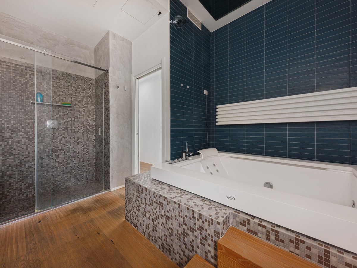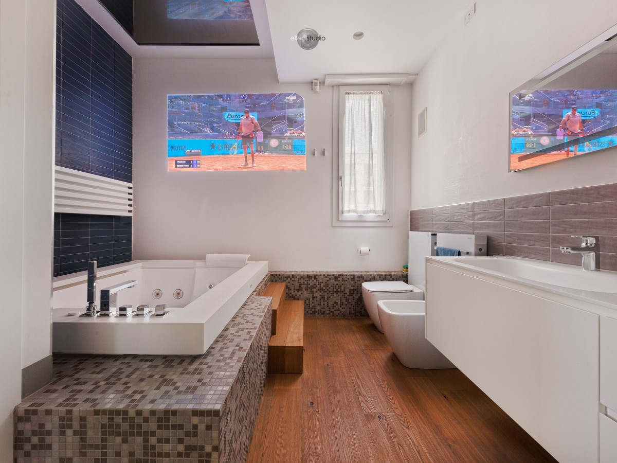 Il disimpegno conduce alla zona notte, impreziosita da luci crepuscolari che accompagnano con discrezione e atmosfera ogni momento della giornata. Qui troviamo due camere da letto e due bagni, di cui uno davvero unico: dotato di vasca idromassaggio a due posti e proiettore integrato, pensato per trasformare la quotidianità in un’esperienza di puro relax.