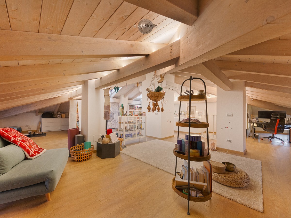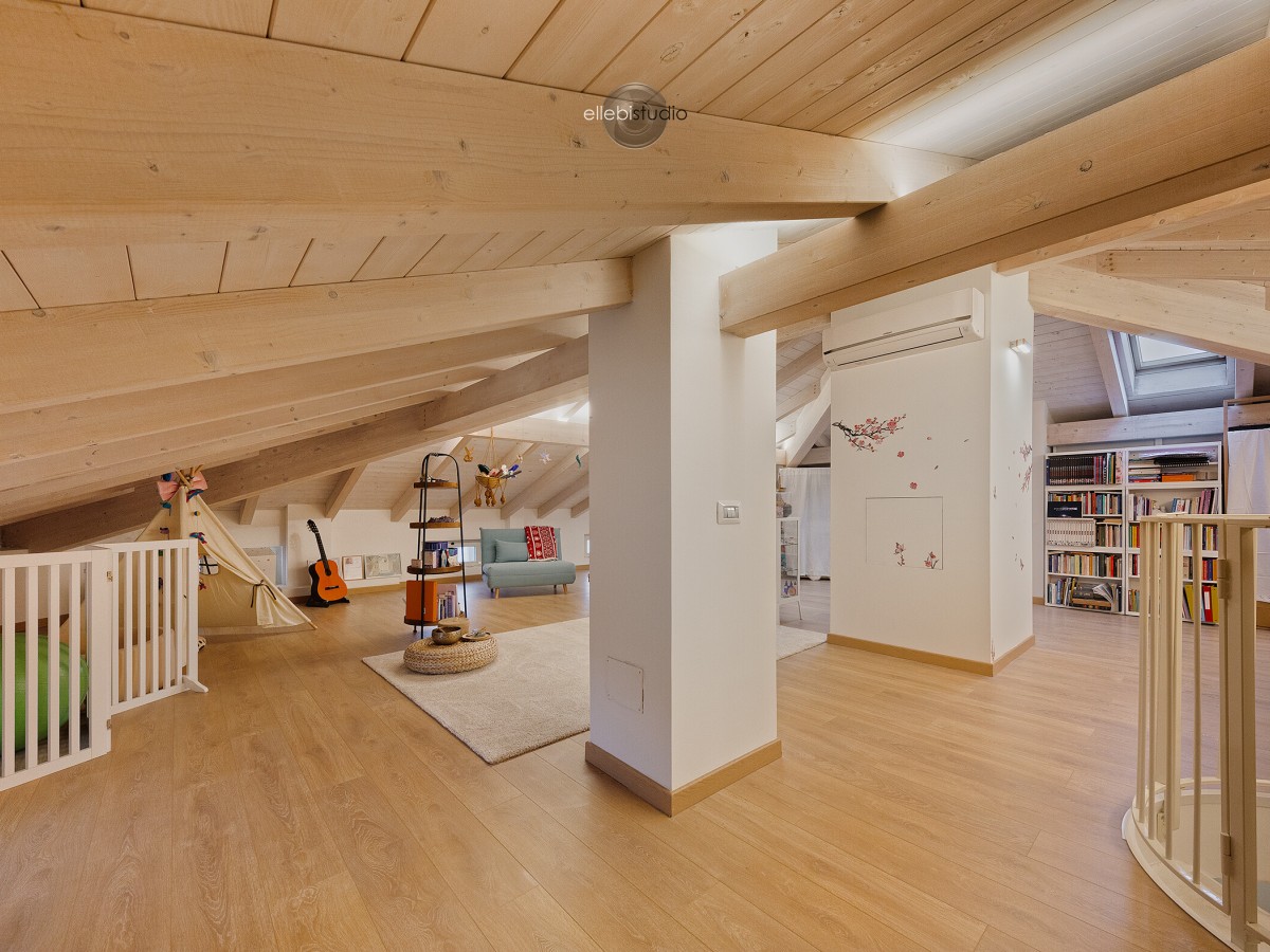 Al piano mansardato, collegato da un’elegante scala di design, trovi un ambiente di 130 mq con travi a vista, caldo e accogliente, facilmente trasformabile in quattro stanze aggiuntive per camere, studio o ambienti smart work, secondo le tue esigenze.