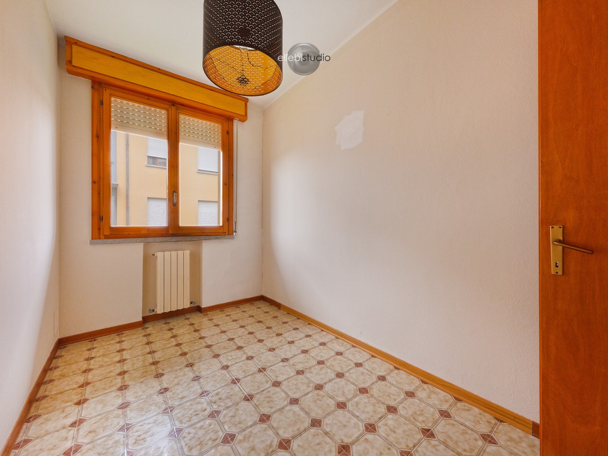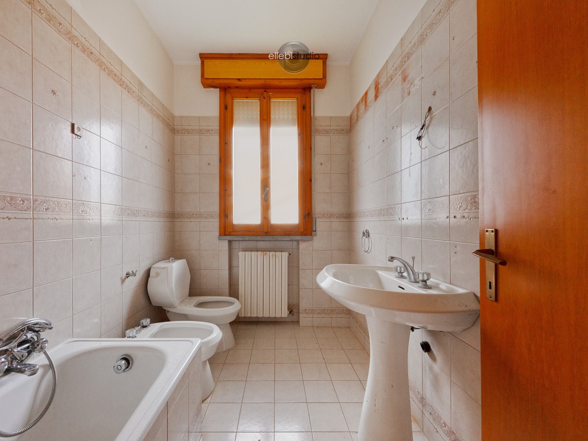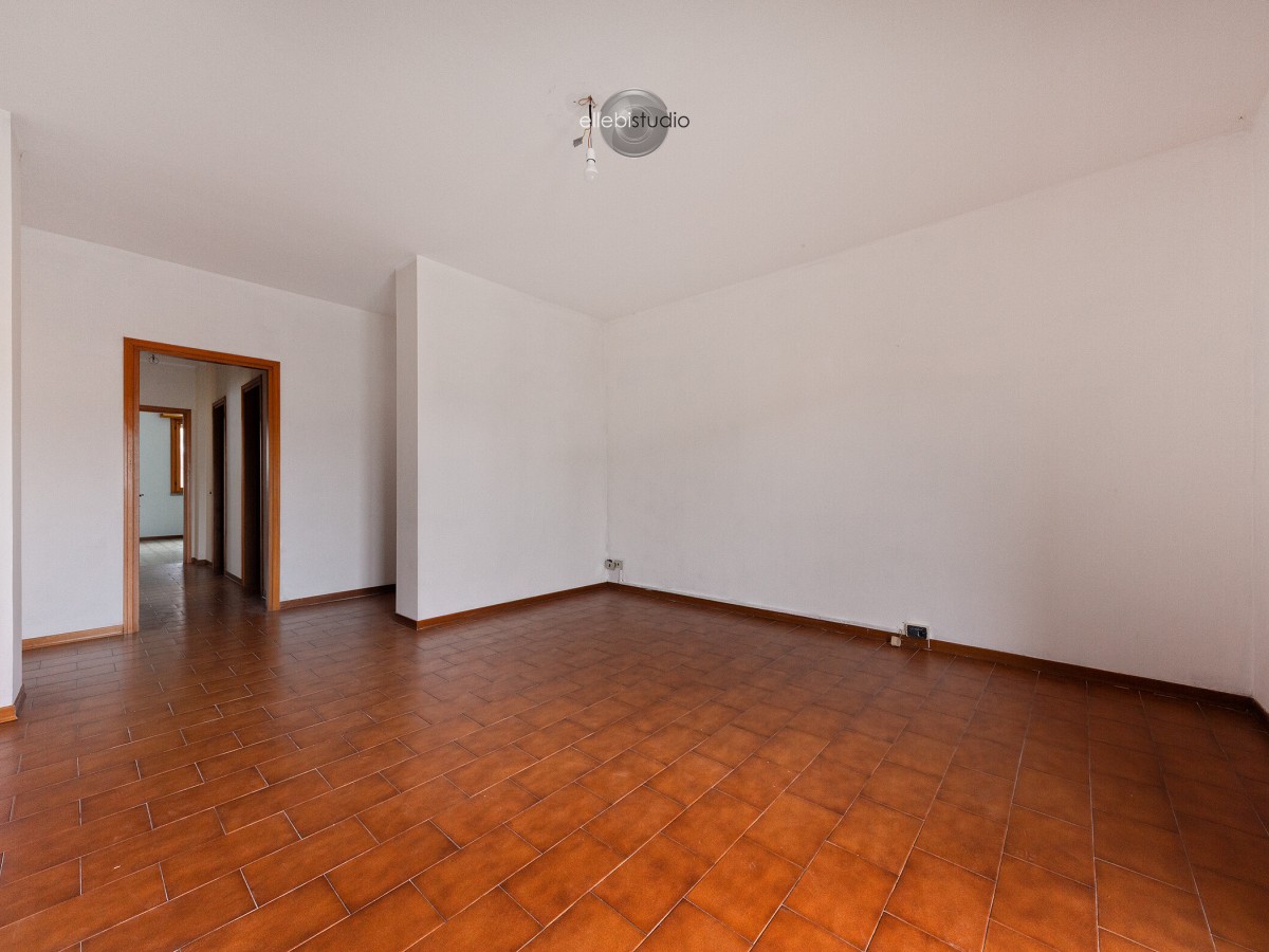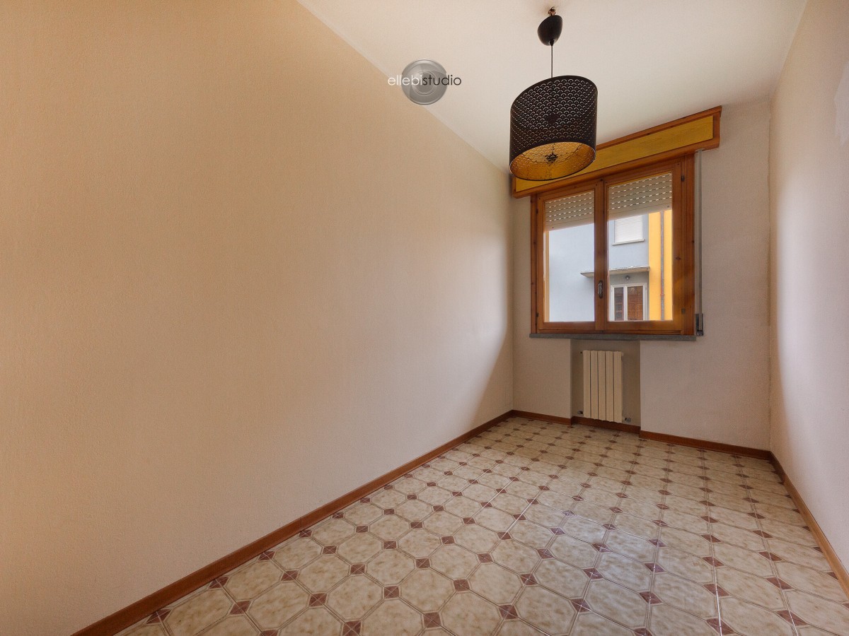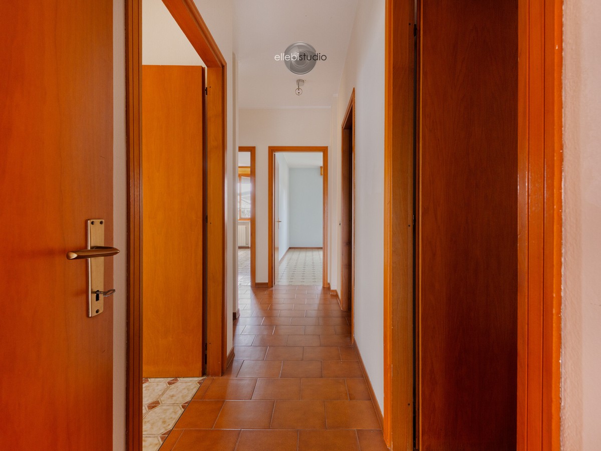 L’appartamento è composto da ingresso, cucina semi-abitabile, ampio salotto, balcone, disimpegno notte, due camere matrimoniali, una camera singola e bagno con vasca. Al piano terra completa la proprietà un garage singolo.