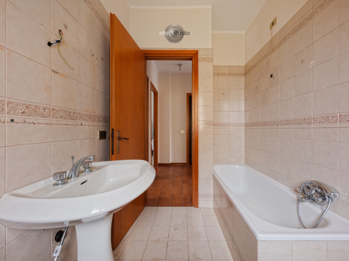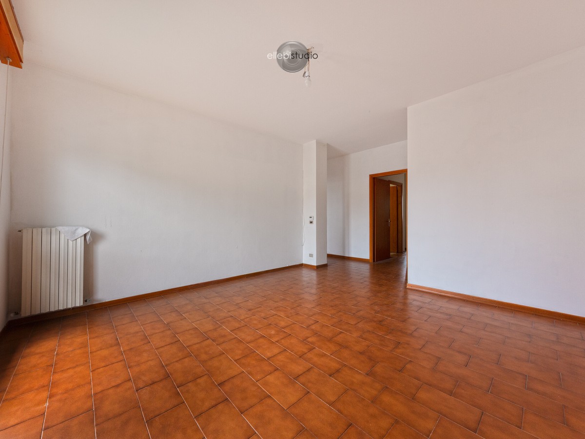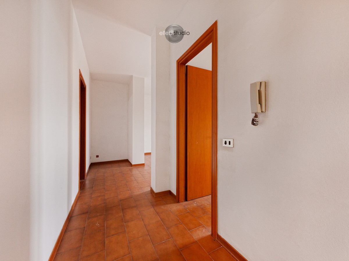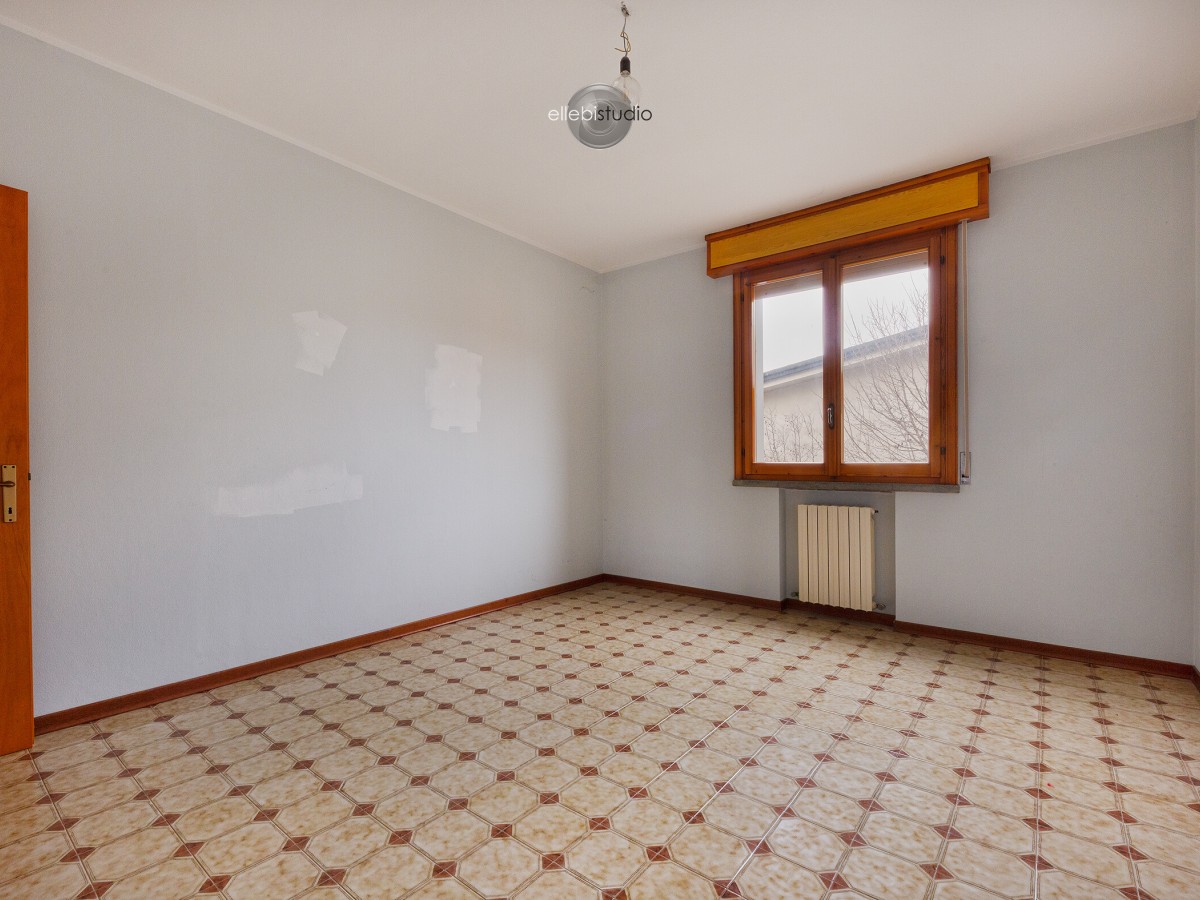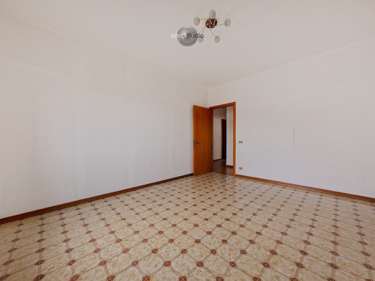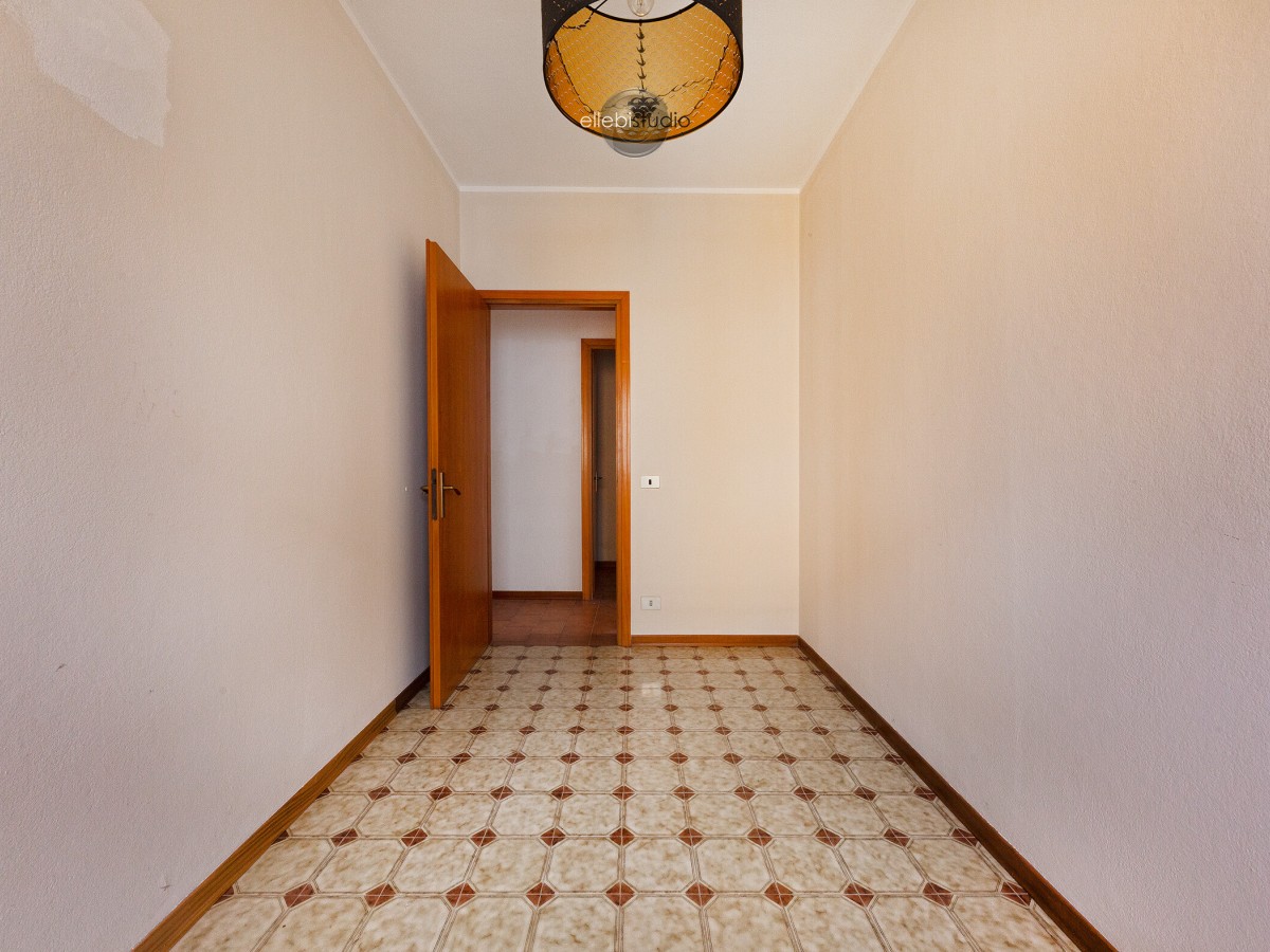 L’appartamento è composto da ingresso, cucina semi-abitabile, ampio salotto, balcone, disimpegno notte, due camere matrimoniali, una camera singola e bagno con vasca. Al piano terra completa la proprietà un garage singolo.