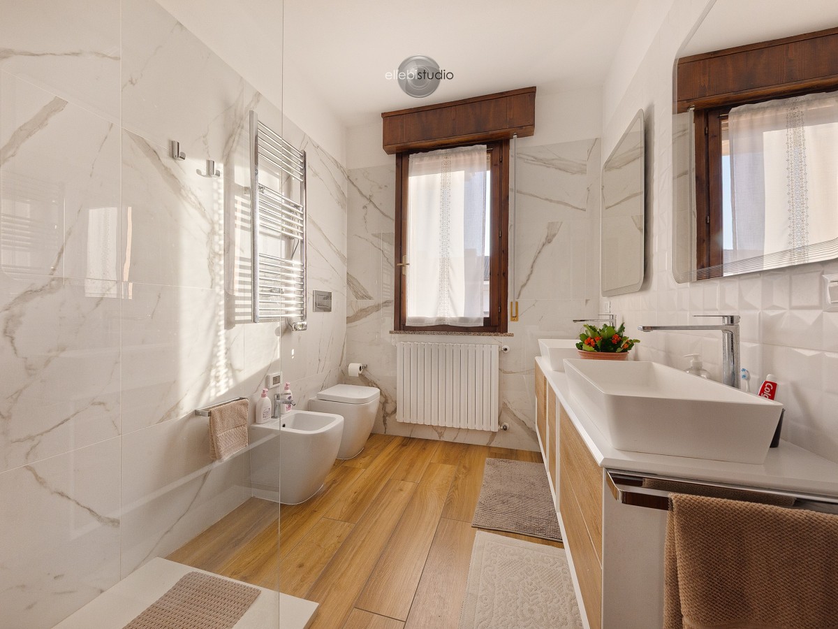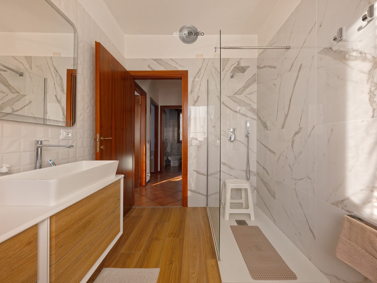 La zona notte comprende due camere matrimoniali di generose dimensioni e due bagni, di cui uno completamente ristrutturato nel 2023 con materiali moderni e di qualità.