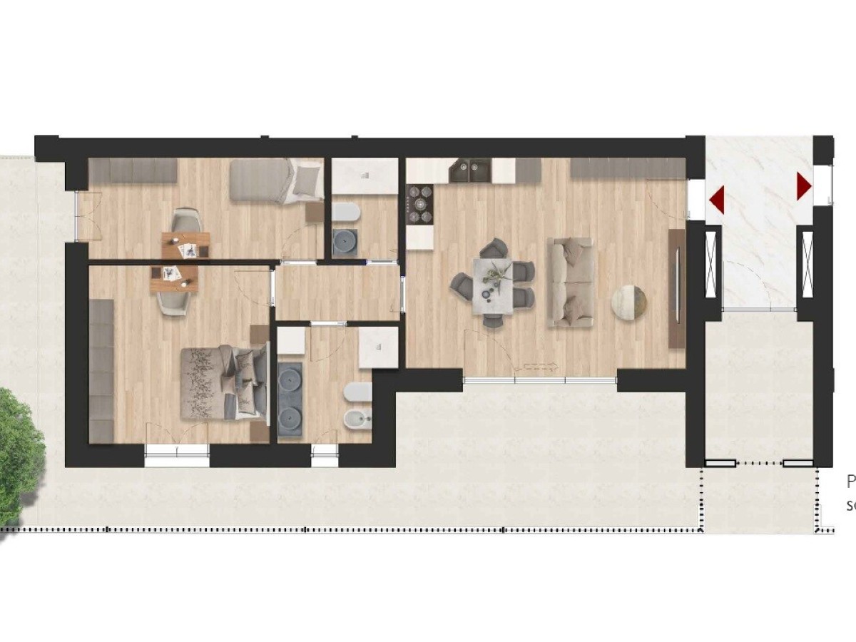 L’appartamento proposto è situato al piano terra ed è caratterizzato da una distribuzione degli spazi pratica e funzionale: ingresso su soggiorno con angolo cottura, ambiente luminoso e accogliente con accesso diretto al portico e al giardino privato di circa 45 mq, ideale per vivere gli spazi esterni in totale tranquillità. La zona notte comprende due camere da letto e due bagni, garantendo comfort e vivibilità sia per famiglie che per coppie.