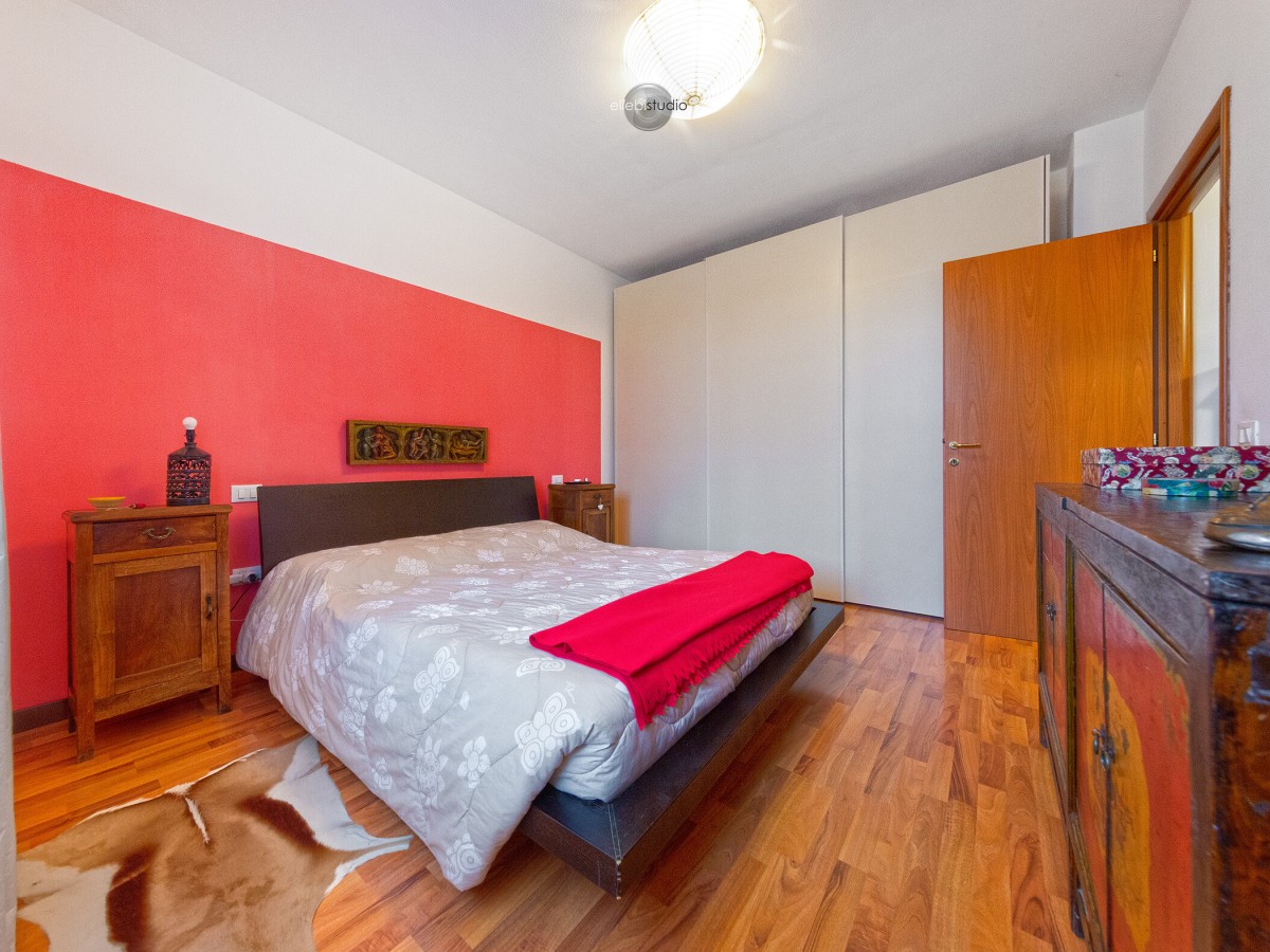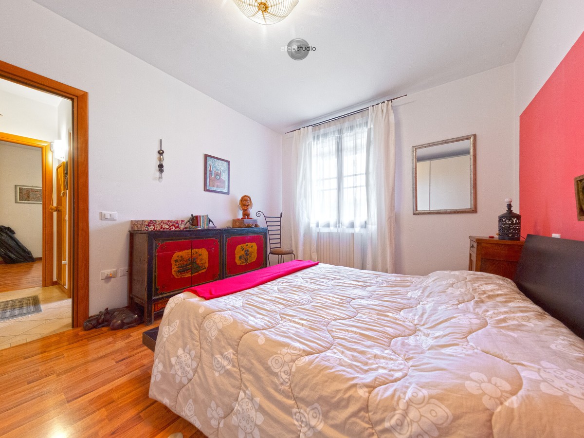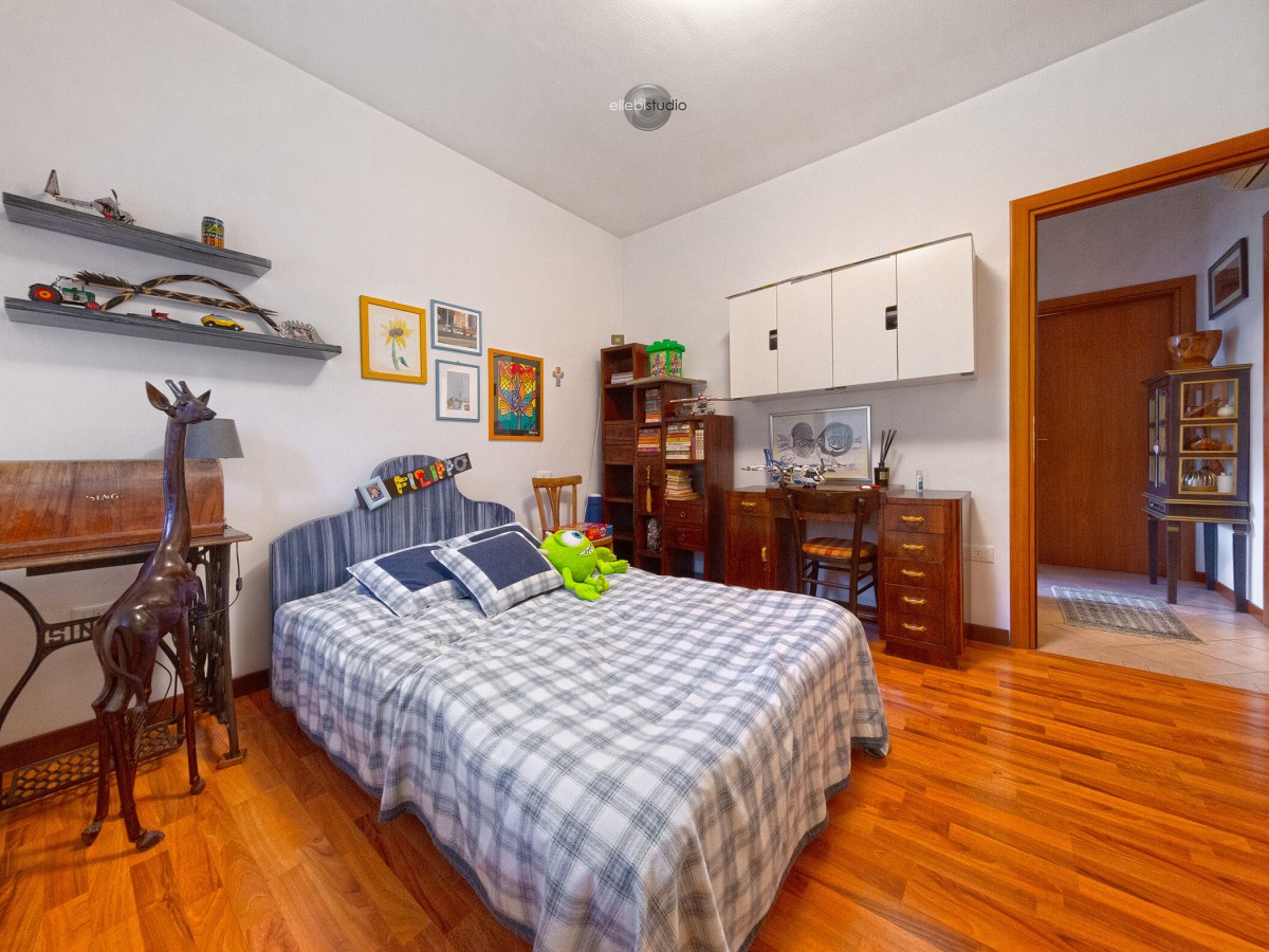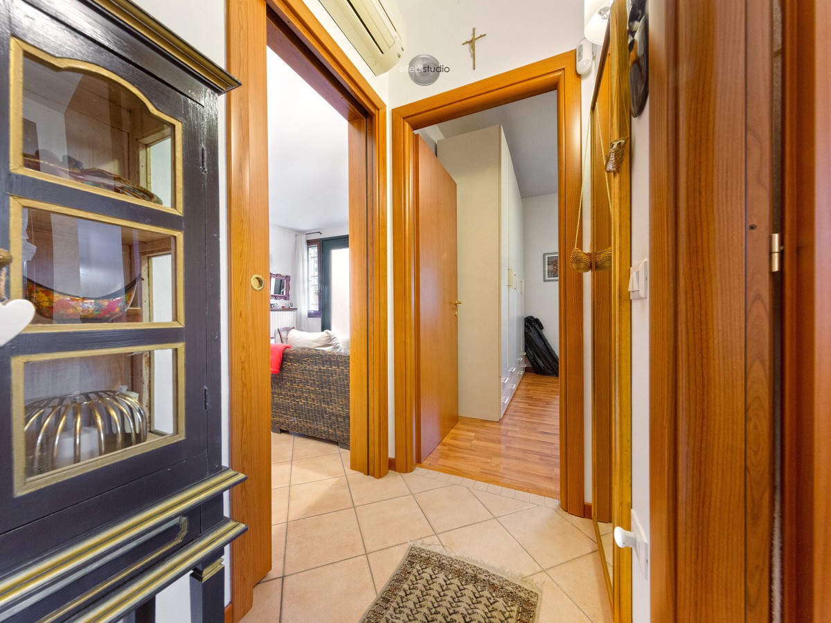 L’ingresso avviene tramite porta blindata e conduce ad un luminoso soggiorno con cucina in open space. A lato troviamo un comodo ripostiglio sottoscala, con accesso diretto al vano scala e all’autorimessa, elemento che rende l’abitazione estremamente funzionale.