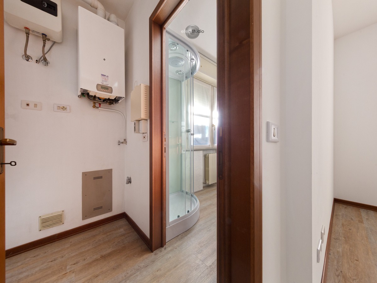L’ingresso si apre su un disimpegno funzionale, trasformabile in zona giorno, adiacente il bagno finestrato con affaccio diretto su un balcone.