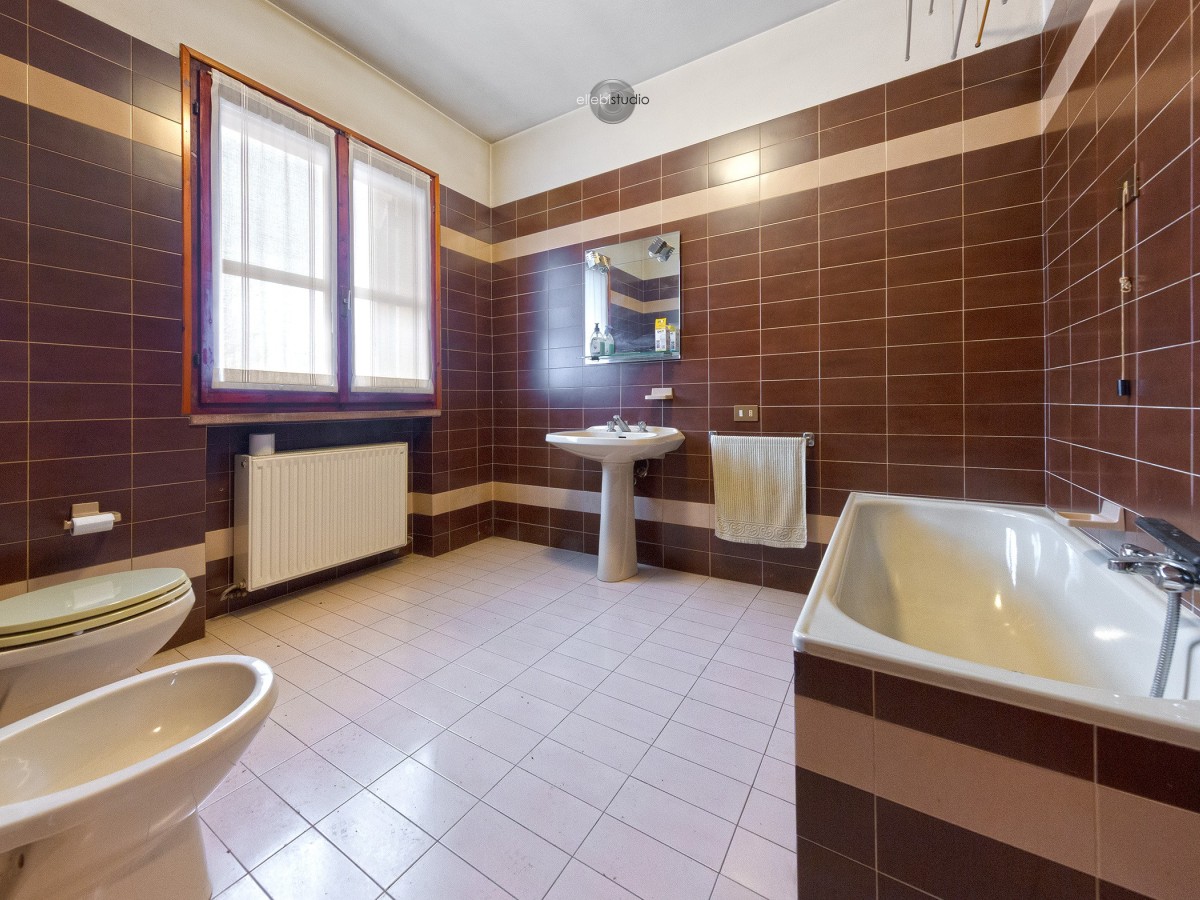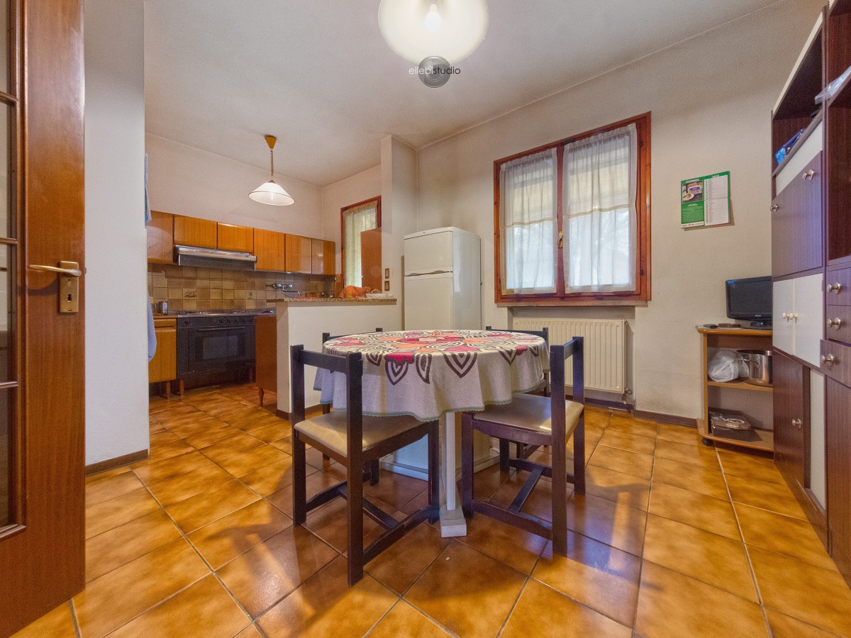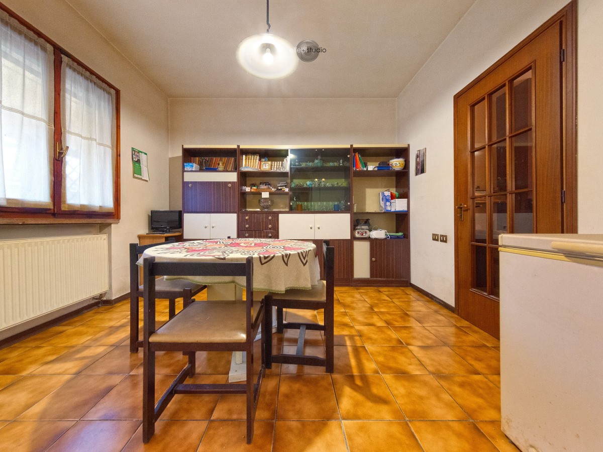 La cucina con sala da pranzo, separata dal soggiorno, rappresenta un importante valore aggiunto: questa disposizione consente una migliore gestione degli spazi e degli odori, mantenendo la zona living sempre ordinata. Dalla cucina si accede direttamente al giardino posteriore, che affaccia sul parco e sulla seconda autorimessa, perfetta come spazio di stoccaggio aggiuntivo o come piccolo laboratorio/hobby.
