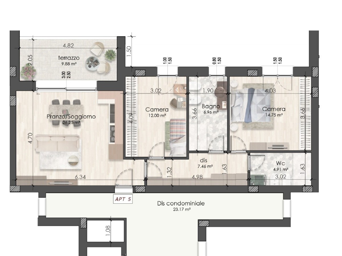 L’appartamento in oggetto si sviluppa al primo piano ed è progettato per offrire ambienti funzionali e ben distribuiti: ingresso su luminoso soggiorno con angolo cottura e accesso al terrazzino, ideale per momenti di relax all’aperto. La zona notte è ben separata e comprende due camere da letto, di cui una matrimoniale e una 3/4, oltre a due bagni, soluzione perfetta per garantire comfort e praticità nella vita quotidiana.