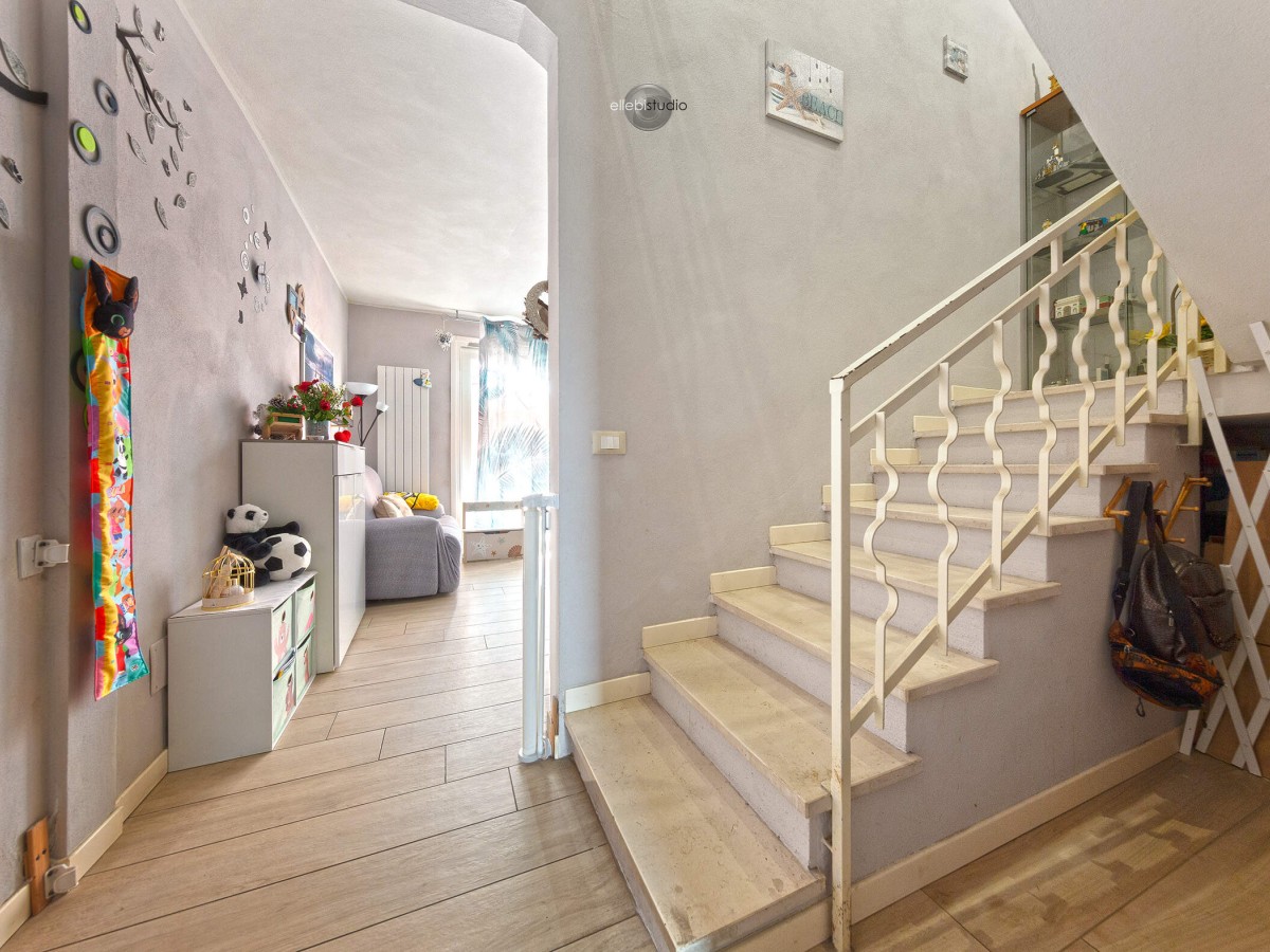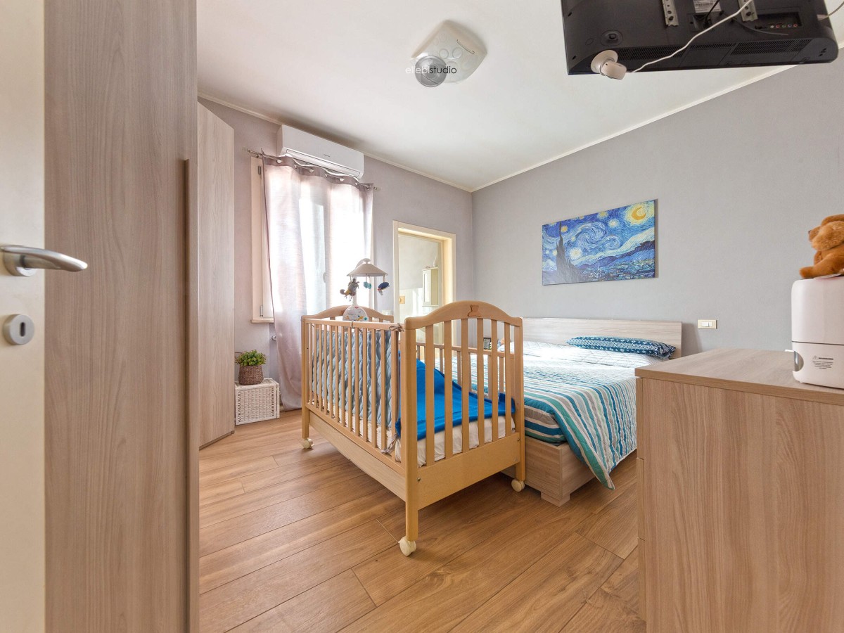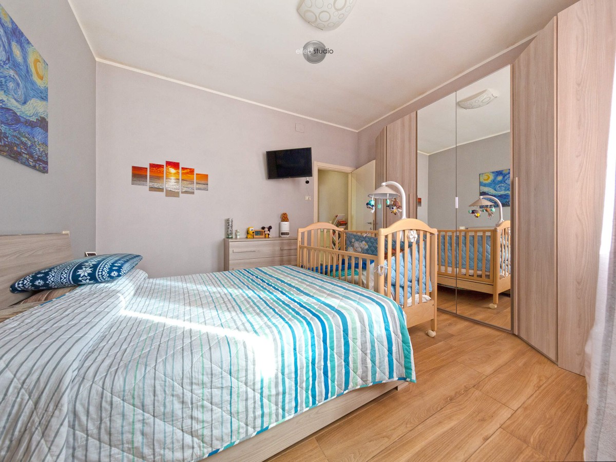 Salendo al piano superiore si sviluppa la zona notte con due camere da letto. Una delle due dispone di bagno privato, una caratteristica sempre più richiesta che garantisce comfort e privacy, rendendo l’abitazione adatta sia a una coppia che a una piccola famiglia.
