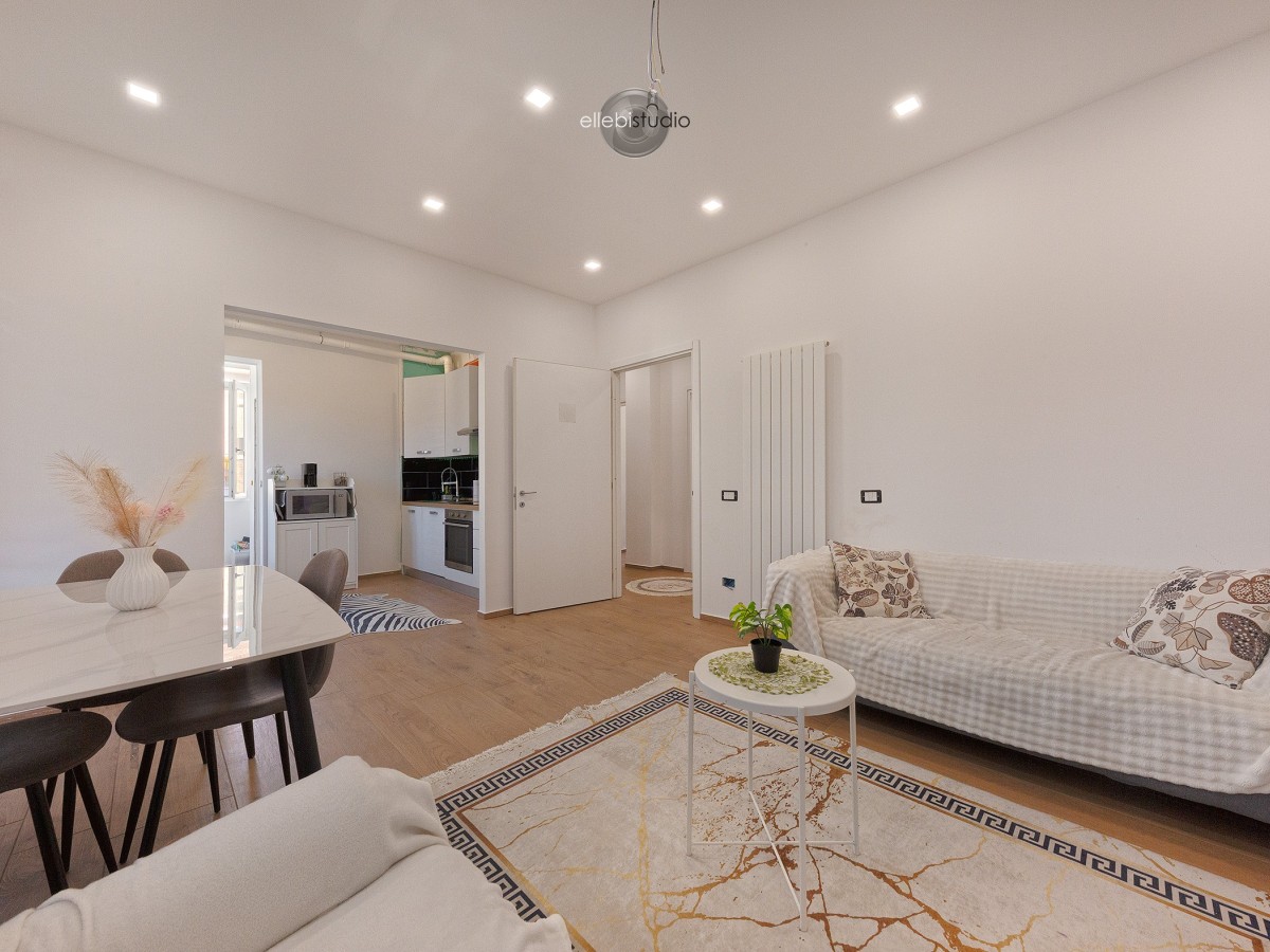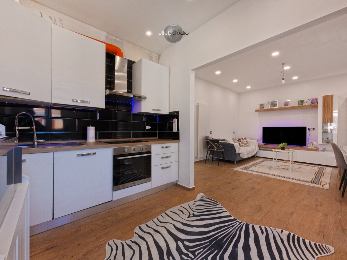 Ampia e luminosa zona living con cucina a vista di design, perfetta per vivere e ricevere ospiti.