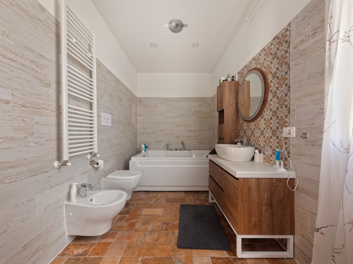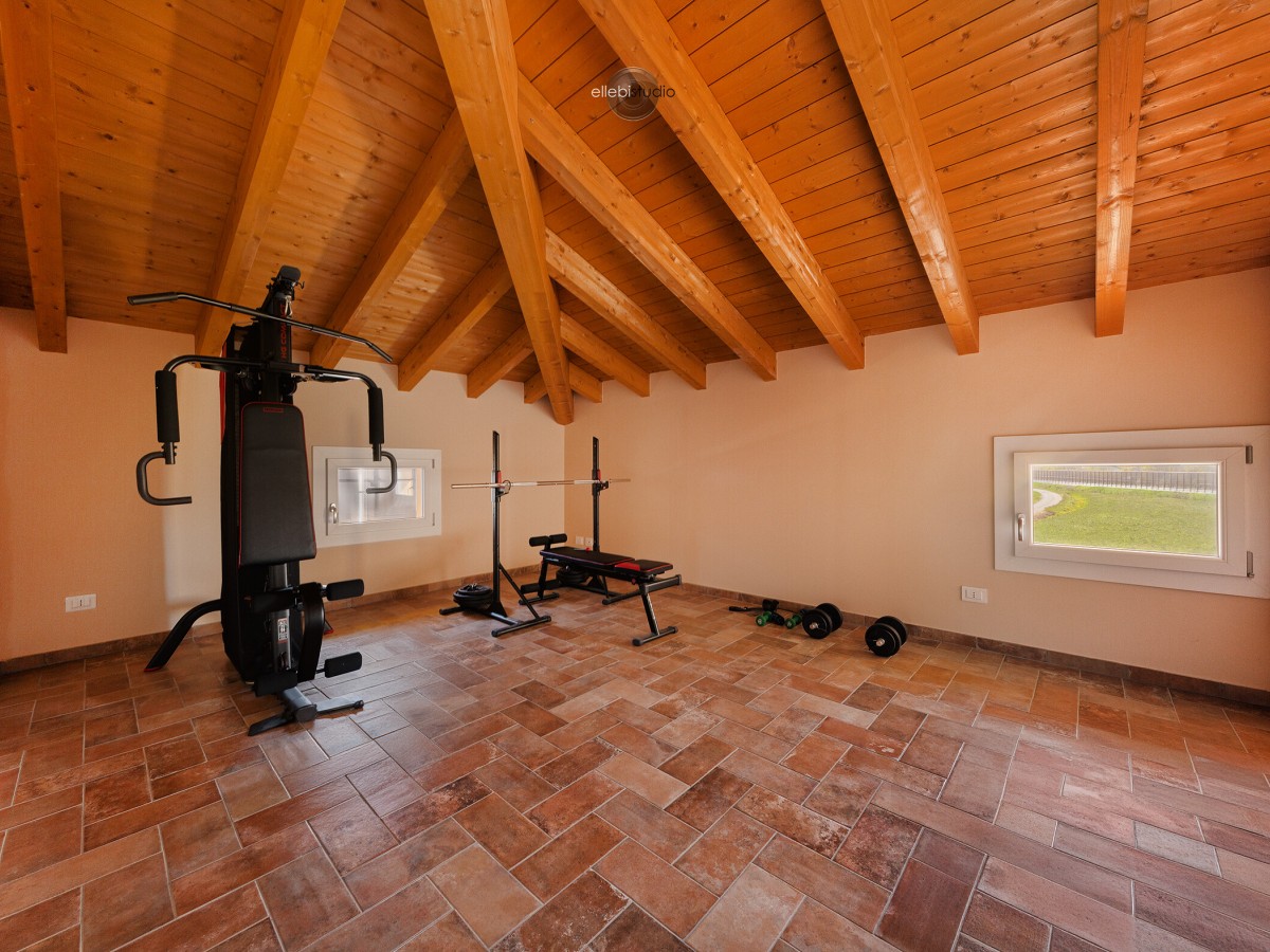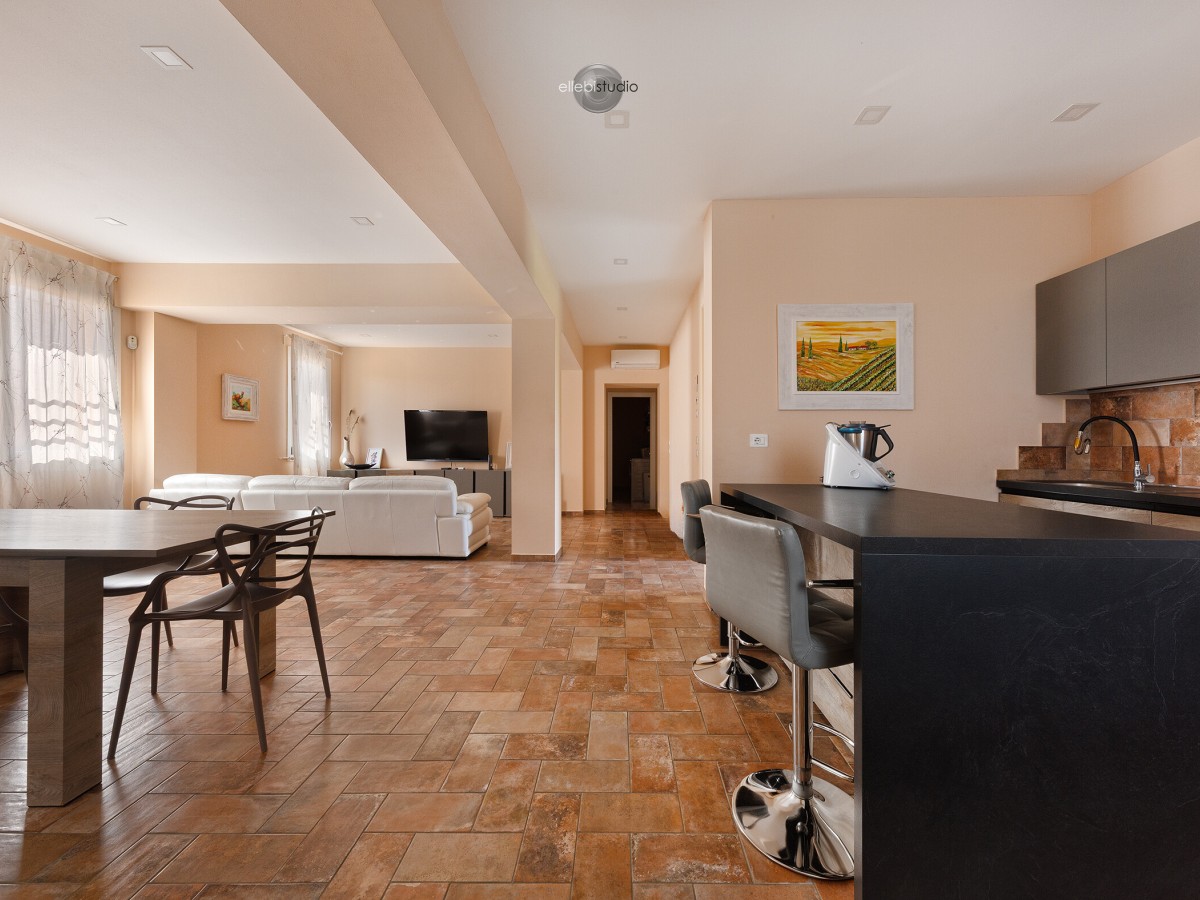 Al piano terra troviamo un’ampia zona giorno open space con soggiorno e angolo cottura, un bagno con vasca idromassaggio, lavanderia e accesso a un ampio deposito di 174 mq complessivi. Al primo piano si sviluppa la zona notte con tre camere da letto (di cui una matrimoniale) e un bagno, mentre al secondo piano è presente la soffitta.