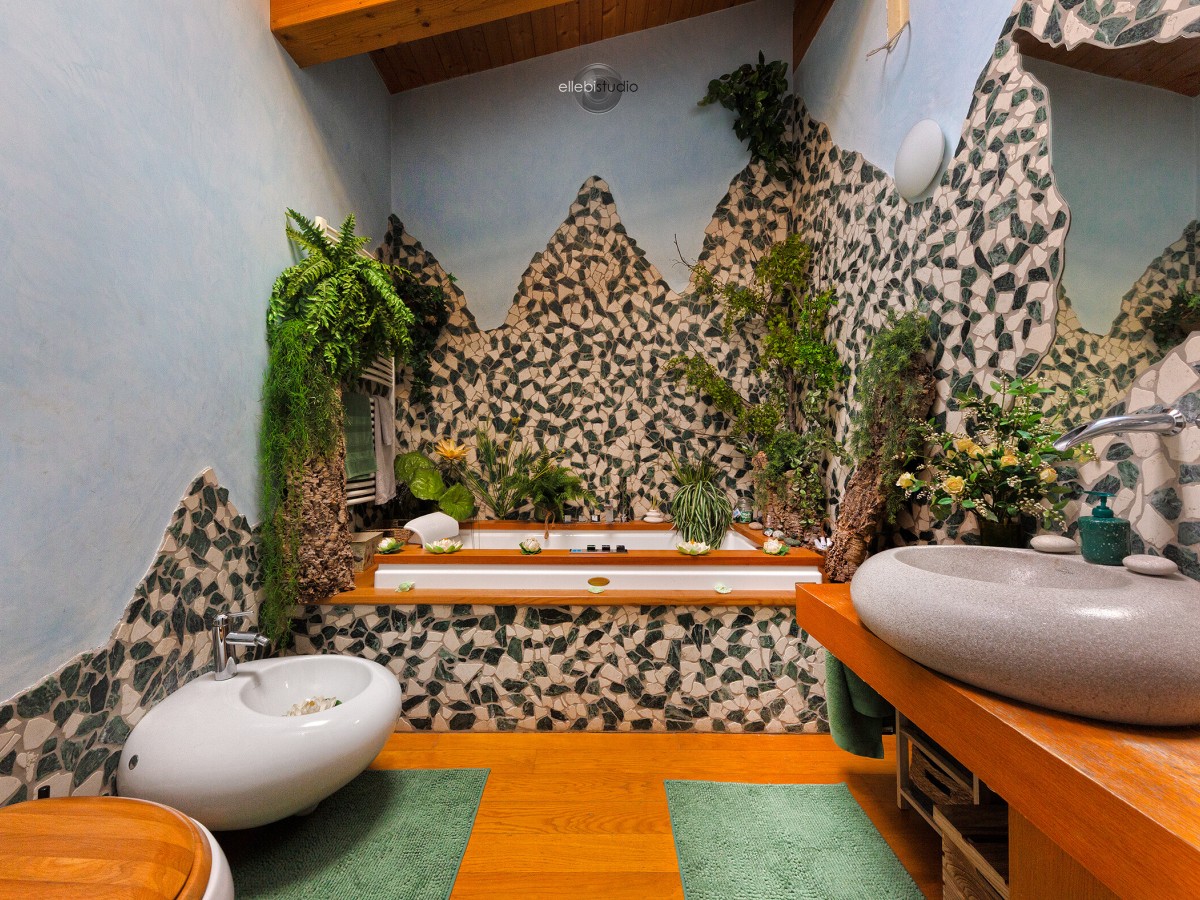 Camera padronale con bagno en-suite decorato con una composizione artigianale di montagne in mosaico di pietre verdi e bianche, arricchita da stucco fluorescente che si illumina al buio
