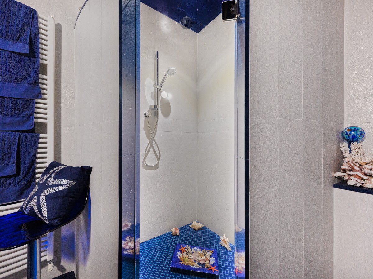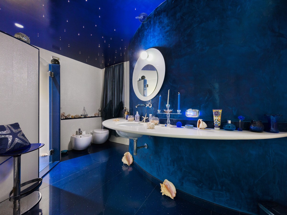 Bagno con doccia caratterizzato da pavimento “starlight”, top in marmo bianco a forma di falce lunare, rubinetteria a cascata e soffitto con fibre ottiche effetto cielo stellato