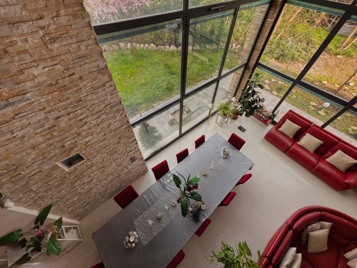 Suggestiva vetrata panoramica con veneziane integrate, regolabili elettricamente sia al piano terra che al primo piano