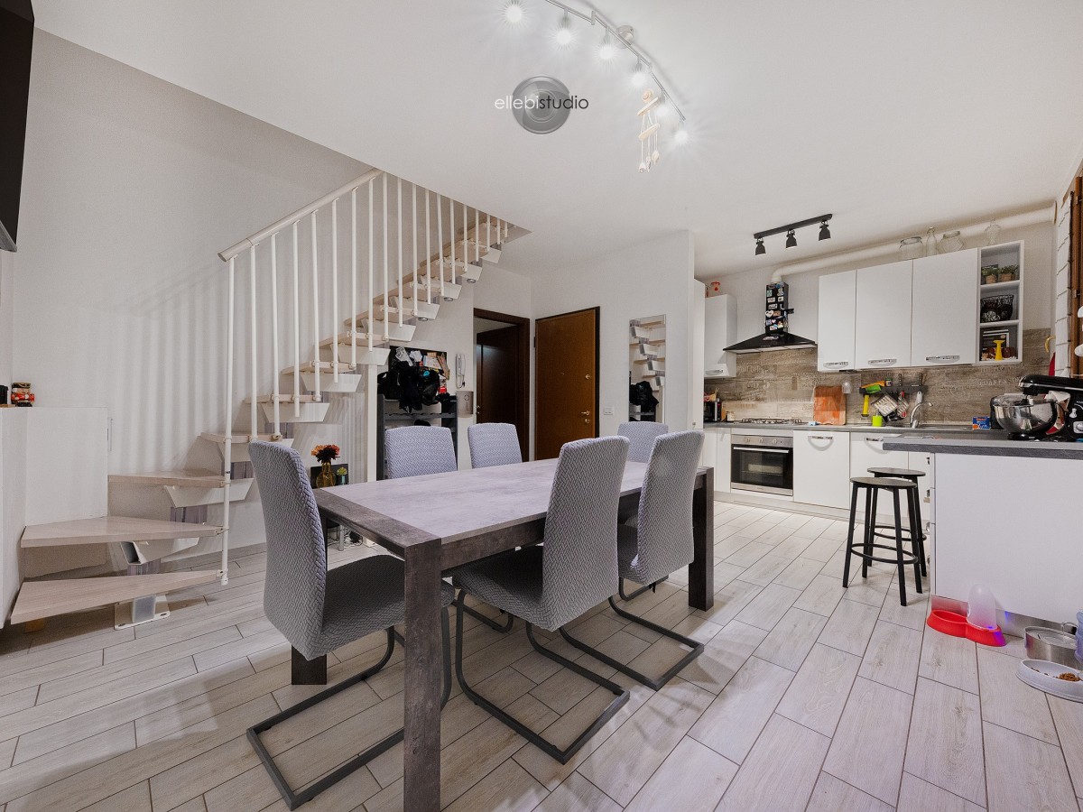 Al primo livello troviamo ingresso su luminosa sala da pranzo con angolo cottura e accesso diretto a uno dei due terrazzi, perfetto per godersi i momenti all’aperto. Un disimpegno conduce al bagno e a un soggiorno, caratterizzato da da un secondo terrazzo che regala piacevoli affacci esterni.