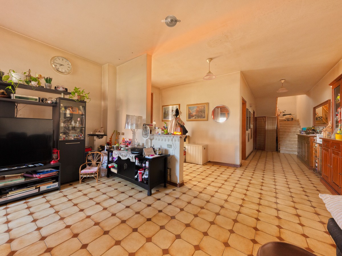 L’ingresso al piano terra conduce a un luminoso soggiorno, una cucina abitabile separata, un bagno e un comodo garage collegato direttamente all’abitazione.
