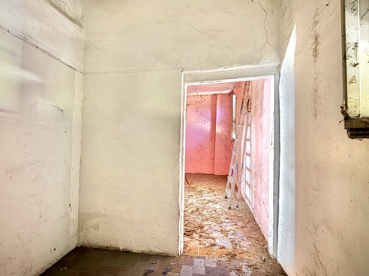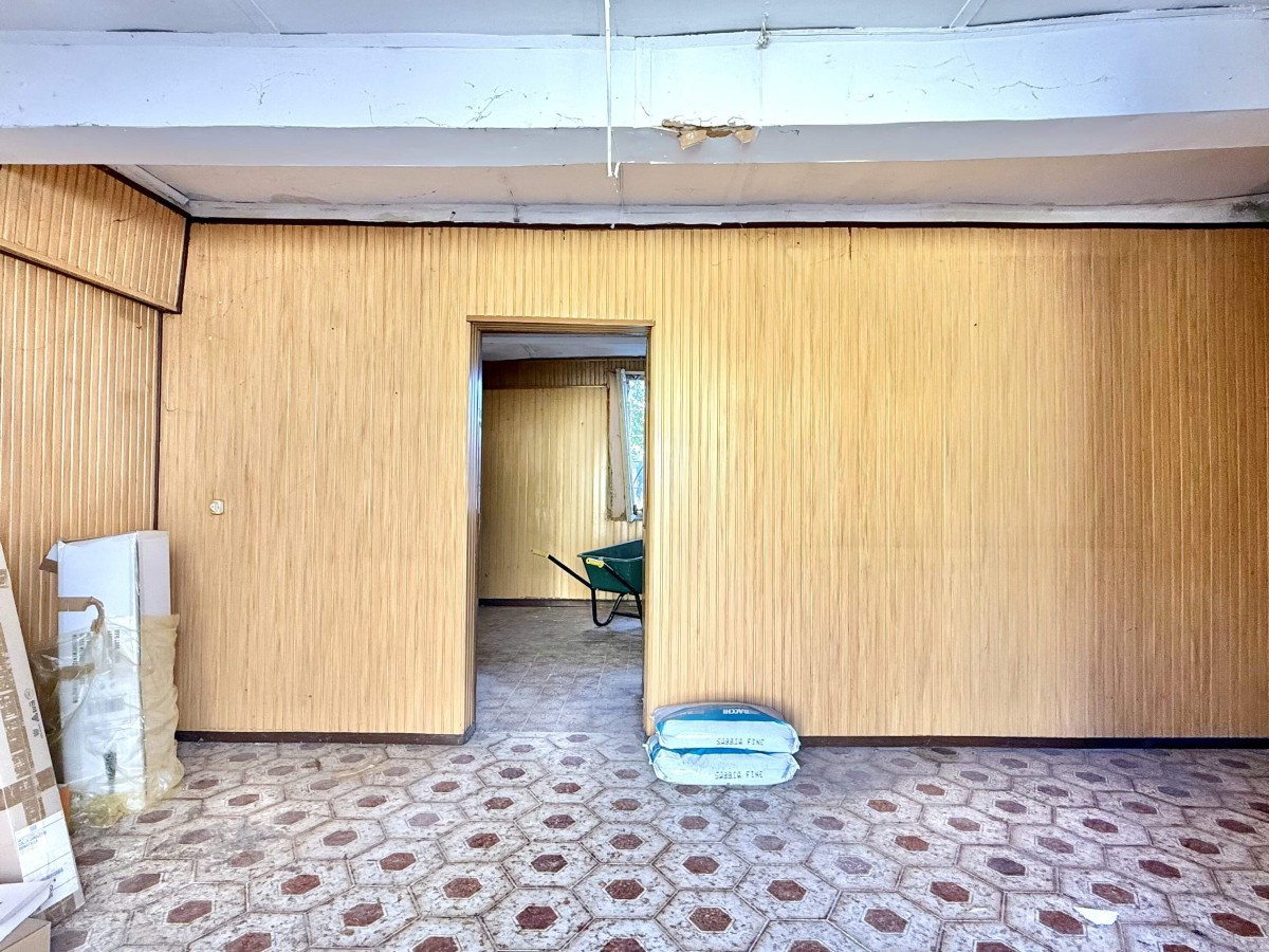 Il piano terra accoglie l’ingresso con disimpegno, dal quale si accede alla zona giorno, attualmente suddivisa in soggiorno e cucina, oltre a un bagno. Gli ambienti, oggi essenziali, offrono la possibilità di essere ripensati in chiave moderna, creando una zona living ampia e funzionale.